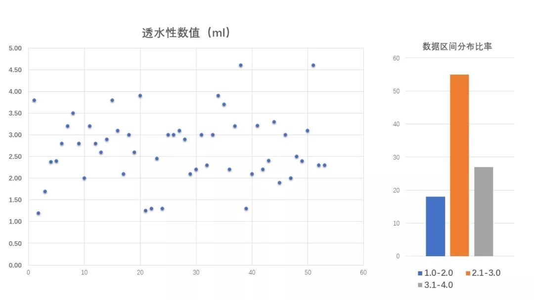 透水性测试结果主要影响来自试验底材,即使同一批次的底材,其初始透水性的个体之间差异在2ml左右很普遍。而板材的本身初始的透水性与试验结果相关很大,故保证整个试验过程(包括板材的养护,制备好涂层的养护及透水试验)在恒温恒湿的试验条件下非常重要!